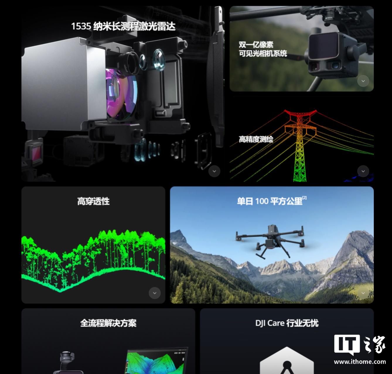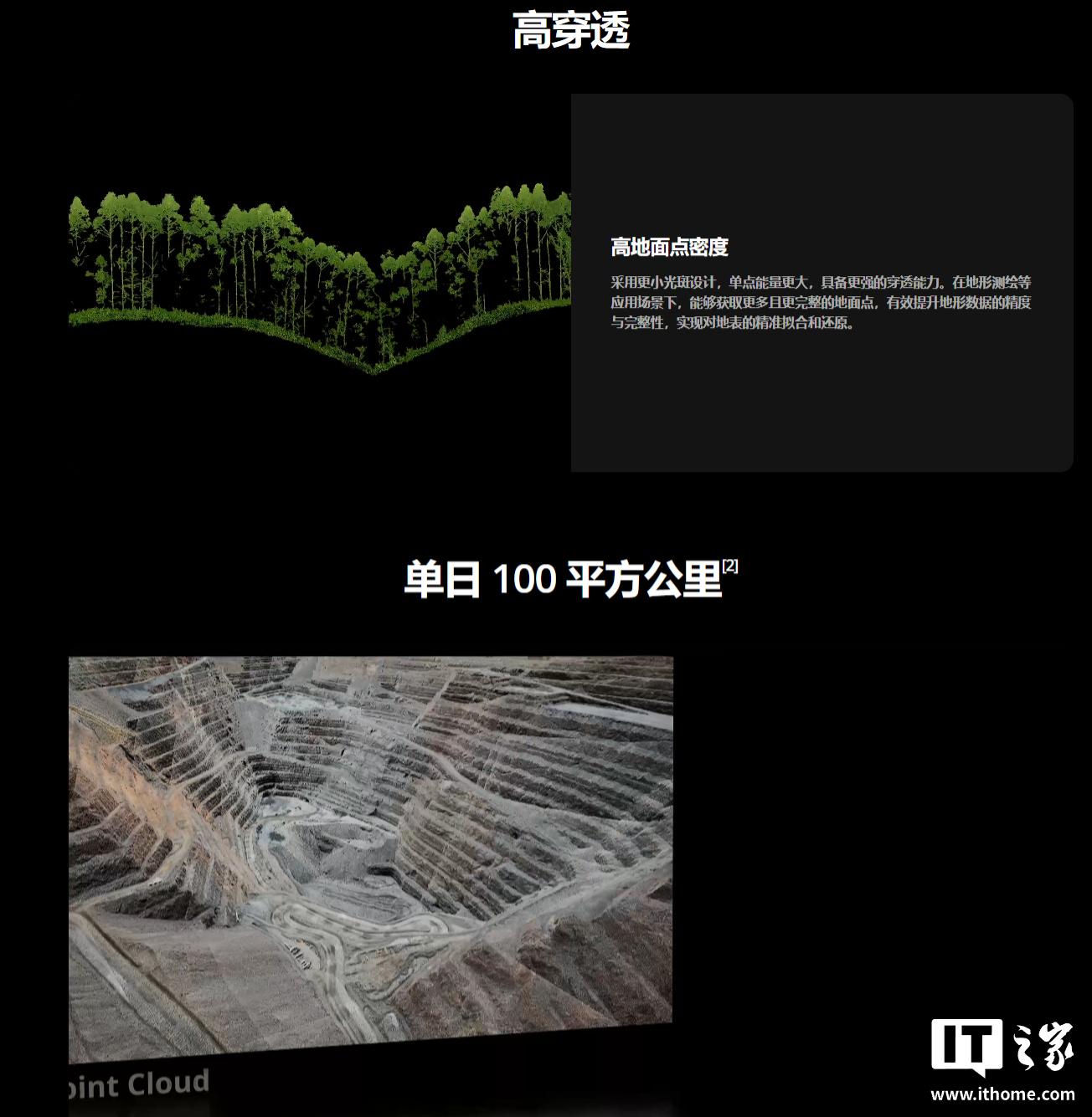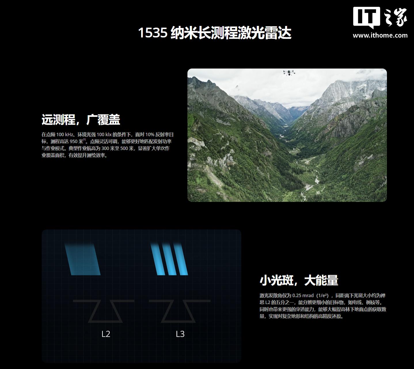 硬件方面,这款产品的激光发散角仅为 0.25 mrad(IT之家注:1 / e²),是前代产品禅思 L2 的五分之一,能识别电线、树枝等更细小的目标物,带来更强的穿透力,还原复杂地形的全貌,最大激光脉冲发射频率可达 200 万点 / 秒,可根据不同场景调整点云密度和穿透能力。