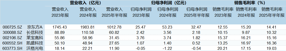 以京东方A为例,2023年至2025年上半年,公司在Mini LED领域实现营收分别为29.02亿元、84.83亿元、43.37亿元,分别同比增长81.42%、49.76%、7.76%;该领域业务利润水平未单独公布。