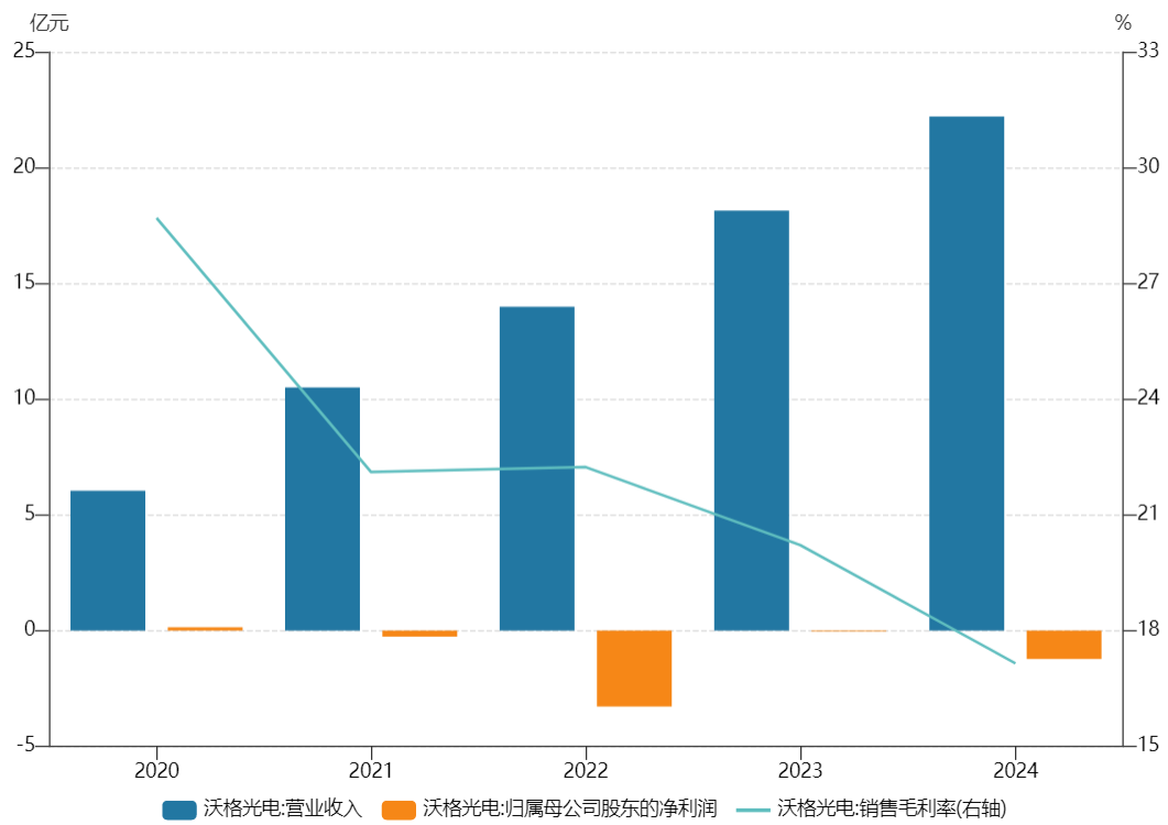 2024年,沃格光电在实现营业收入同比增22.45%至22.21亿元的同时,亏损1.22亿元,同比大幅下滑达2594.85%。